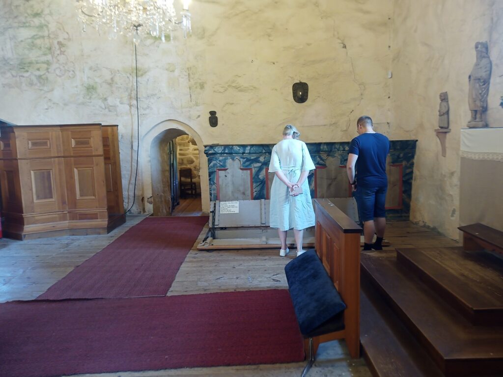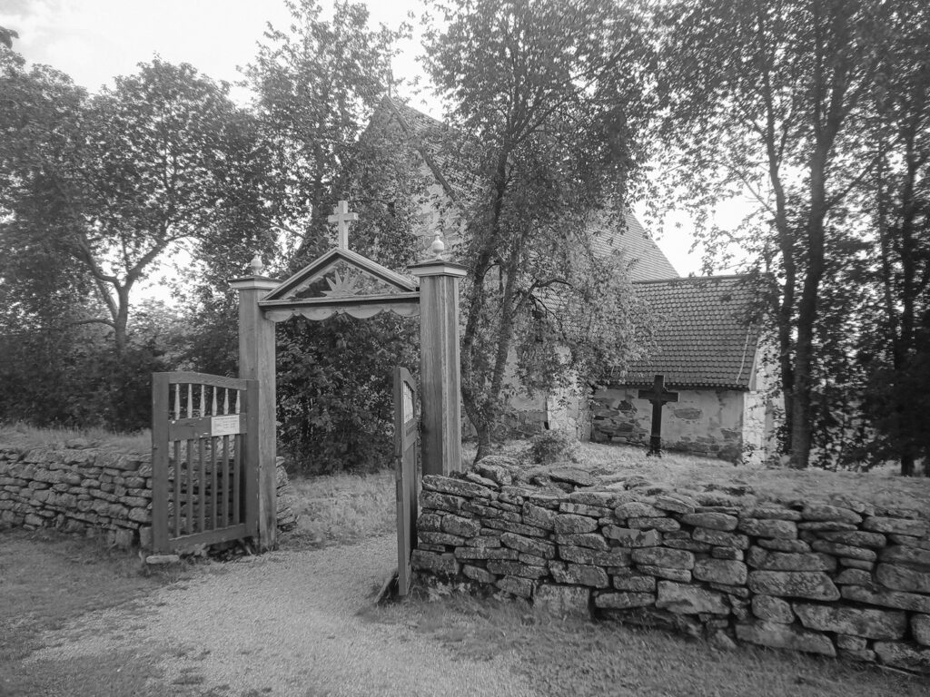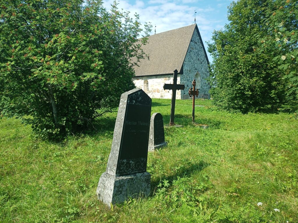 Jag går ett svep runt kyrkan med kameran, för att känna in platsens atmosfär, innan jag går in. Stavar mig igenom de finska inskrifterna på kors och gravstenar. Begrundar förgänglighetens symboler i form av timglas och nedåtvända facklor. Hela platsen doftar av solvarma smultron. Inte på grund av något övernaturligt ingripande, utan för att det växer just solmogna, solvarma smultron på kyrkogården. Trots universitetsstudier i religionsvetenskap, funderar jag över huruvida det är rätt att plocka och äta av döingarnas smultron eller inte. Vad konsekvenserna eventuellt kan bli. Om det mirakulösa konserveringsmedel som bevarat Nikolaus Rungius kropp möjligen har sugits upp ur jorden av smultronen, och äter man av dem så kanske man själv får del i detta mirakel.