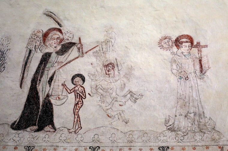 Intill målningen av S:t Bernardino i Anga kyrka finns en målning av Kejsar Henriks själavägning. Det handlar om den tysk-romerske kejsaren Henrik II (973-1024) som ligger på sin dödsbädd, och trots att han 1146 kom att helgonförklaras var hans liv inte helt helgonlikt. På målningen vägs kejsarens onda och goda gärningar av ärkeängeln Mikael, medan demoner hänger tungt på den syndens vågskål där kejsarens själ befinner sig. I sista stund räddas kejsaren av helgonet S:t Laurentius (Lars), som lägger det halster han själv stektes levande på i den motsatta vågskålen. Detta som tack för att kejsaren på sin dödsbädd skänkte en stor guldkalk till Laurentiusklostret i Merseburg. På S:t Lars kropp är brännmärkena efter halstret tydligt markerade, och då han stektes på halster över glödande kol den 10:e augusti år 258 trycktes enligt legenden även glödgade högafflar mot hans kropp. 55 år senare förkunnade det milanesiska ediktet religionsfrihet i romarriket, och förföljelserna mot kristna upphörde. År 381 blir kristendomen officiell statsreligion i romarriket, och därefter börjar kristna systematiskt förfölja hedningar, inklusive kristna som inte är godkända kristna.